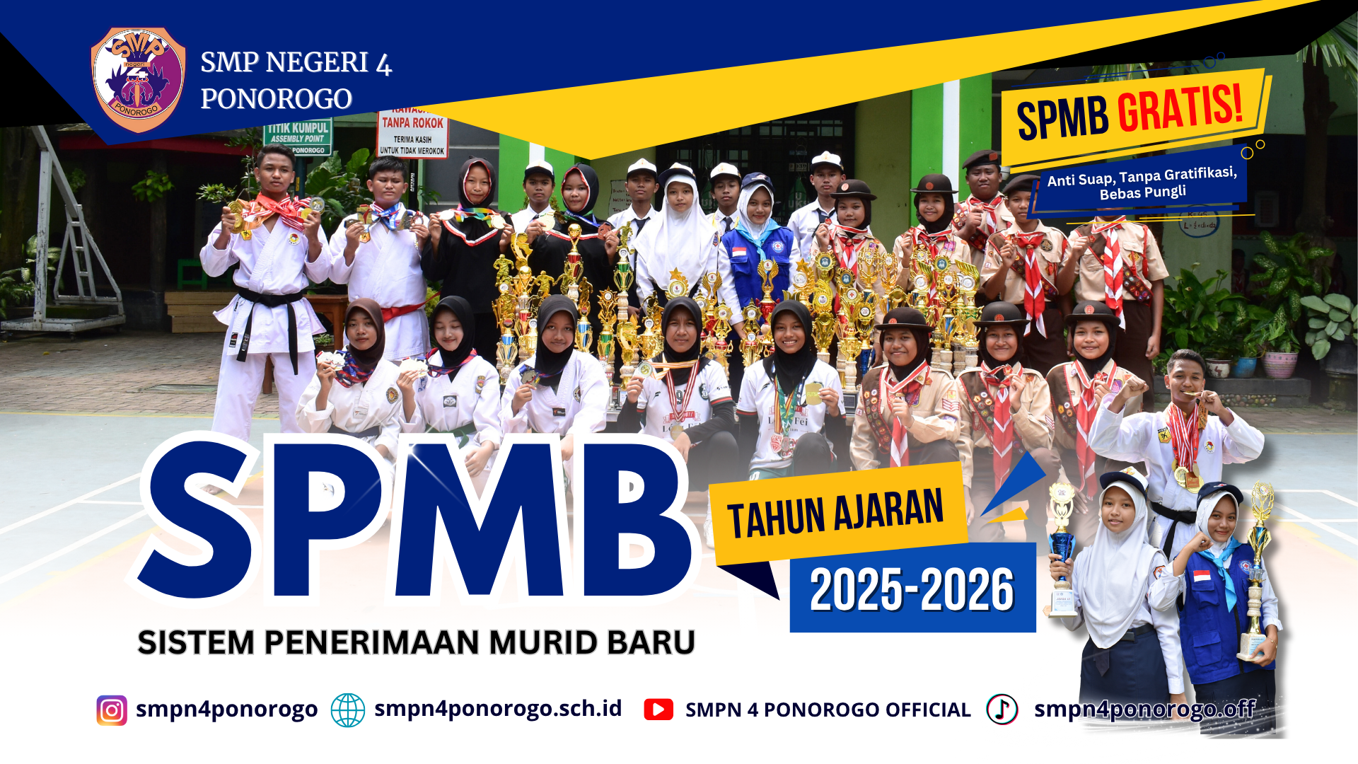 Selamat datang di laman informasi Sistem Penerimaan Murid Baru (SPMB) SMP Negeri 4 Ponorogo Tahun Ajaran 2025/2026. SPMB merupakan mekanisme …
